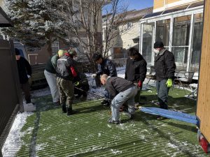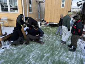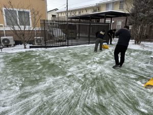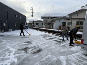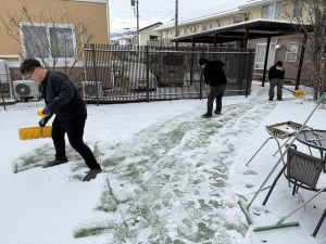 順次出勤してくるスタッフ達も雪かきに参加してくれて